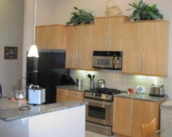 This custom kitchen with its clean lines was constructed with flat panel full overlay doors and accented with full bullnose mouldings top and bottom. It is has a harvest gold finish and brushed stainless steel hardware. The tops are polished granite. Completed 10/01 |