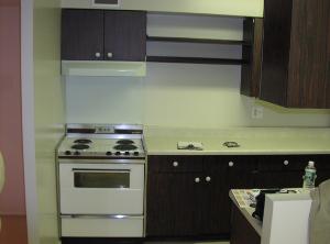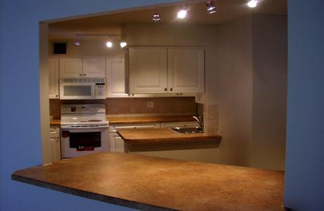 Completed 2/05 This project is in a center city high rise and features custom thermofoil cabinetry we fabricated and custom bevel edge laminate counter tops. The back splash is tumbled marble and the floor is laminate. We also cut a hole through the wall between the kitchen and living room and installed cabinetry with a island top. Before After |