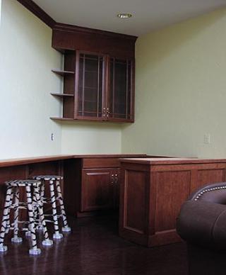 This wet bar was fabricated from cherry veneer and hand selected solid cherry mouldings with Conestoga CRP10 style doors capped with a large colonial crown moulding.The counter top is inlayed tumbled marble tiles with a solid cherry edge treatment. Completed 4/2002 Design by Judith Drake Designs |