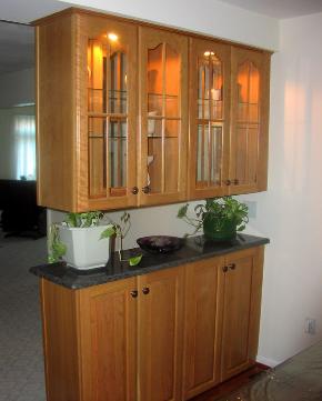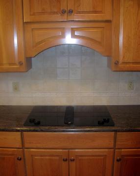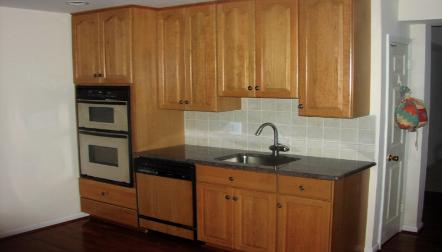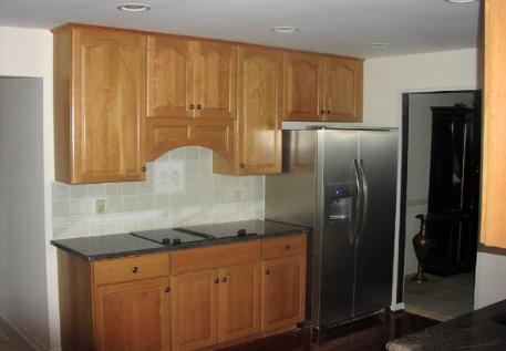 This project involved removal of the existing soffits above the wall cabinetry and removal of a bearing wall to give the kitchen a more open feel and add more cabinet space. We installed a new ceiling with recessed lighting and new hardwood flooring. Cabinetry is Conestoga CRP30 in cherry with a nutmeg finnish. The counter tops are granite with an undermount stainless steel bowl and the back splash is ceramic tile. Completed 12/04 |