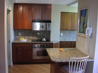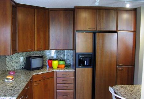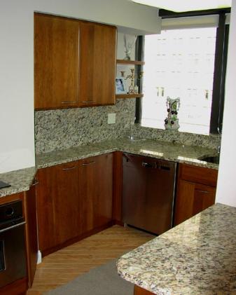 This custom kitchen is fabricated with solid cherry flush batten doors and drawer fronts. They are done in a honey finnish and have stainless steel hardware. All the cabinets are custom fit for this space and include solid wood dovetail drawers. The counter tops are granite with a granite backsplash Design by Barbara Hanselman |