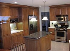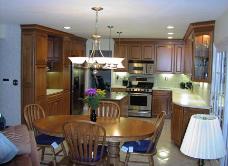 This kitchen remodel is Conestoga craftsman series plywood cabinet with CRP 20 raised panel doors. The island is custom made by us and has matching conestoga doors. They are finnished with a Honey stain. We removed the existing soffits and installed 36" wall cabinets with a large ornimental crown and natural cherry egg and dart insert. We also installed new sheetrock with recessed lighting and hanging light fixtures. The main counter top is Corian solid surface and the island is toped with granite. The back splash is tumbled marble. Completed 10/03 Design by |