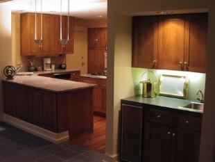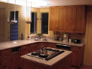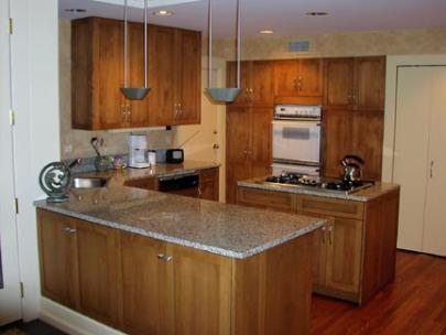 This goal of this project was to dramaticly change the look of this kitchen with a limited budget. So we removed the almond doors and laminate exteriors of the existing cabinetry, we installed new maple veneer and new solid maple doors, drawers and end panels. The finnish is autumn stain with a brown glaze and laquer top coat. Because we did not change the floor plan we were able to reuse the existing granite counter tops. Designed by Judith Drake Interiors Completed 9/2002 |