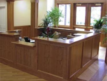 This is a reception desk we made for a local insurance company. It is fabricated with cherry panels with a clear finish and a solid cherry top. On the inside we wrapped a laminate counter top attached to file storage cabinets. Completed 9/01 |